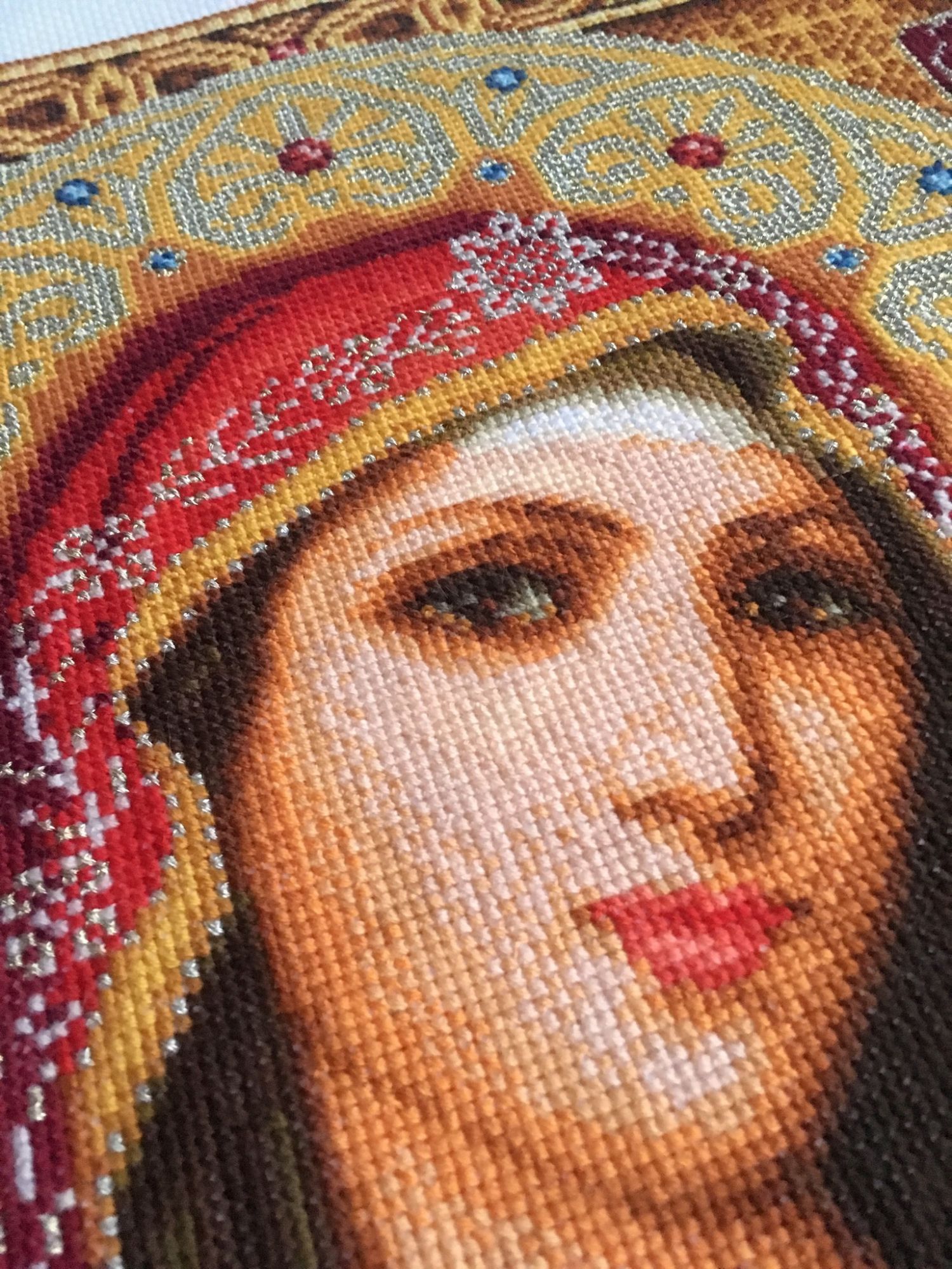 13 апреля 2019 Закончила процесс с иконой, делюсь фотографиями процесса спешу поделиться впечатлениями о работе с нанесённым рисунком на канву. 1. В работе присутствует металлик, который очень сильно замедлил процесс вышивки работы и немного меня понервировал. Нужно приноровиться, чтобы научиться ладить с этими нитками, они сложно достаются из пасмы, металлическая часть нитки часто рвётся и приходится закреплять и обрезать нить. Если кто планирует вышивать, то металлик лучше поменять на катушечный. Прежде чем научилась им вышивать извела 3 пасмы, но этого металлика производитель положил с большим запасом, осталось 2 пасмы каждого из металликов. 2. Мулине ровно ложились и крестики пухленькие. Приятно вышивать схс. 3. Канва с рисунком просто сказка, чёткие символы, удобно вышивать. Сама канва сначала жесткая, но в процессе работы стала помягче. 4. Пару символов всё-таки продавец не пропечатал на канве и в схеме тоже были белые клеточки, так что зашила их на своё усмотрение. 5. Небольшой минус наборах с напечатанном рисунком на канве всё-таки есть. Пару мест у меня недовышит верхняя часть крестика, потому что рисунок на канве иногда замаливает глаз (внимательнее надо быть). В целом впечатления от набора положительные (если бы не было металлика, то впечатления были бы намного лучше). Гало4ка, Nyurka-86, Дикая белочка и 8 других сказали спасибо Поделиться сообщением Ссылка на сообщение