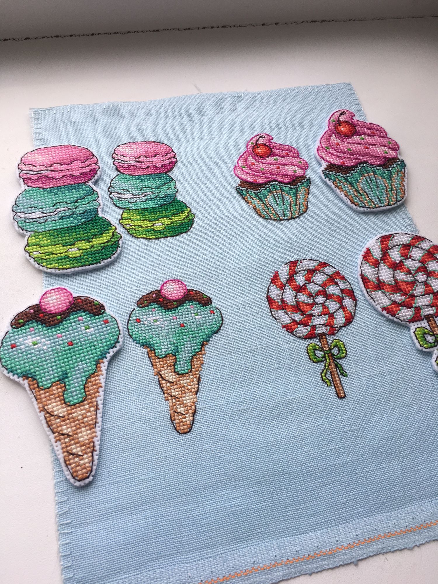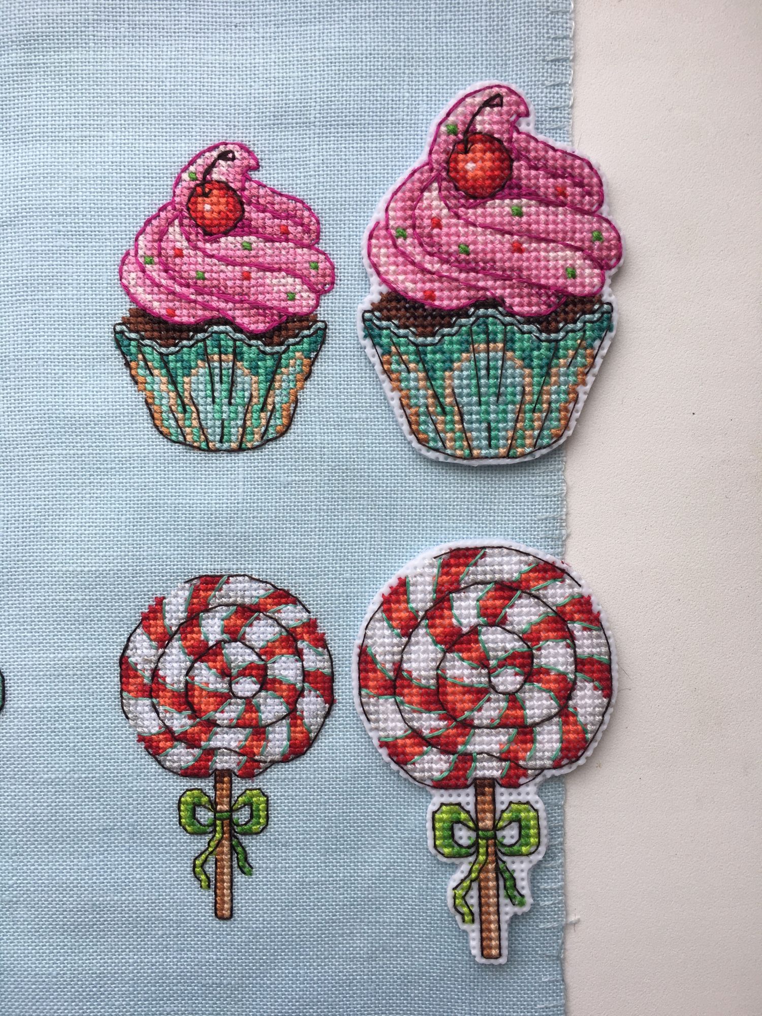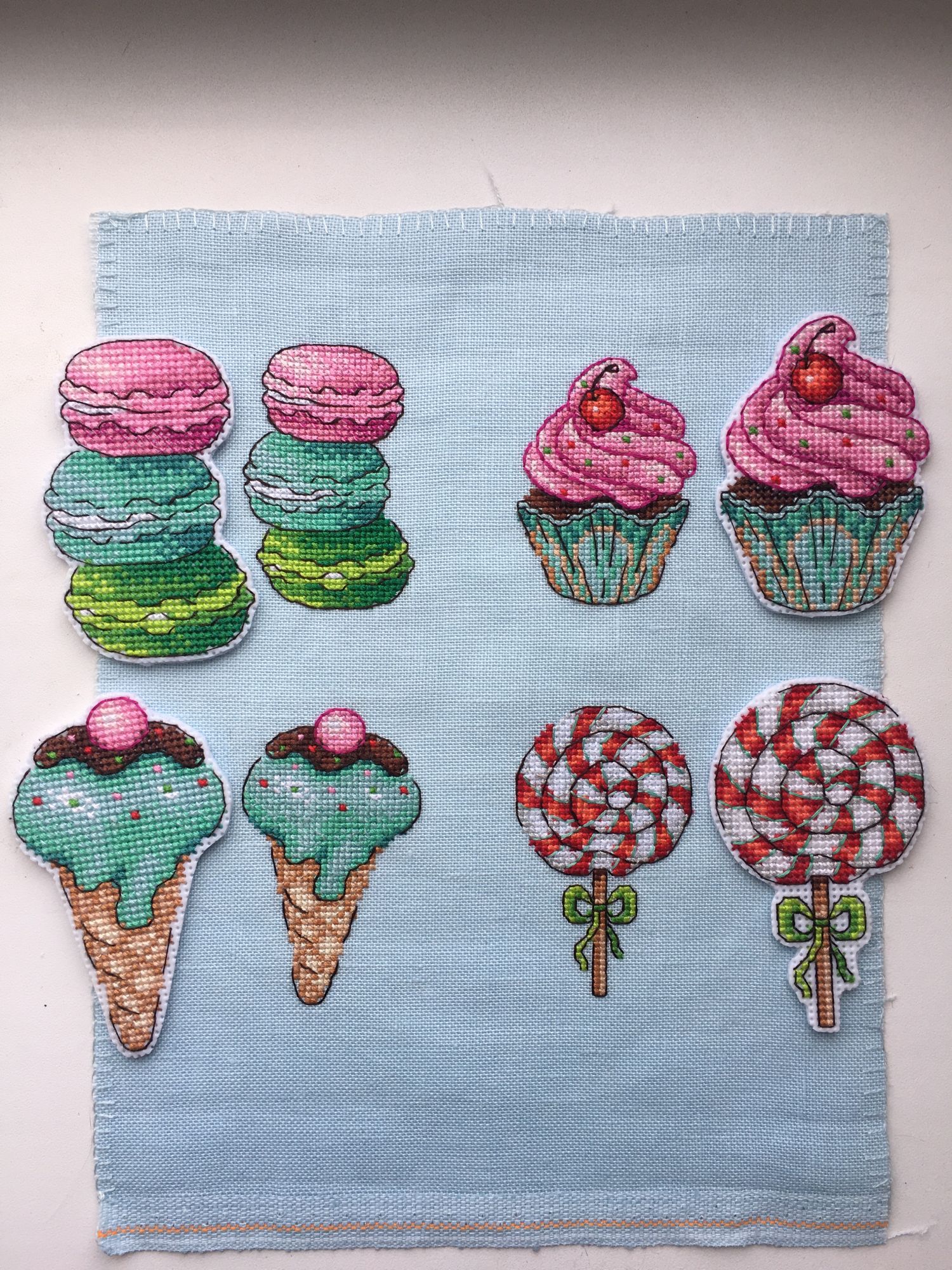 23 июля 2022 Оставались у меня остатки от набора МП Студия Р-272, Сладости для радости. Магниты, и ниток достаточно много было, решила вышить второй раз, но уже на равномерке голубого цвета. Вот что из этого получилось МП Студия Р-272, Сладости для радости. Магниты Так как равномерка была 32 каунта, то младости подучились поменьше размером (в наборе пластиковая канва 14 каунта), для сравнения на фото магниты из первого отлива на пластике. Всех ниток кроме одного цвета (номер 8 на планшетке) хватило на второй отшив, нехвативший цвет подобрала в нитках DMC цвет 992. Разница в заменённом цвете почти незаметна (мятный цвет в бленде на мороженом в рожке). Если надо будет вышить ещё эти сладости, то с удовольствием повторю процесс, он легкий и доставляет море удовольствия, бэк не сложный)))) nogres, 19199707770, Дикая белочка и 6 других сказали спасибо Поделиться сообщением Ссылка на сообщение